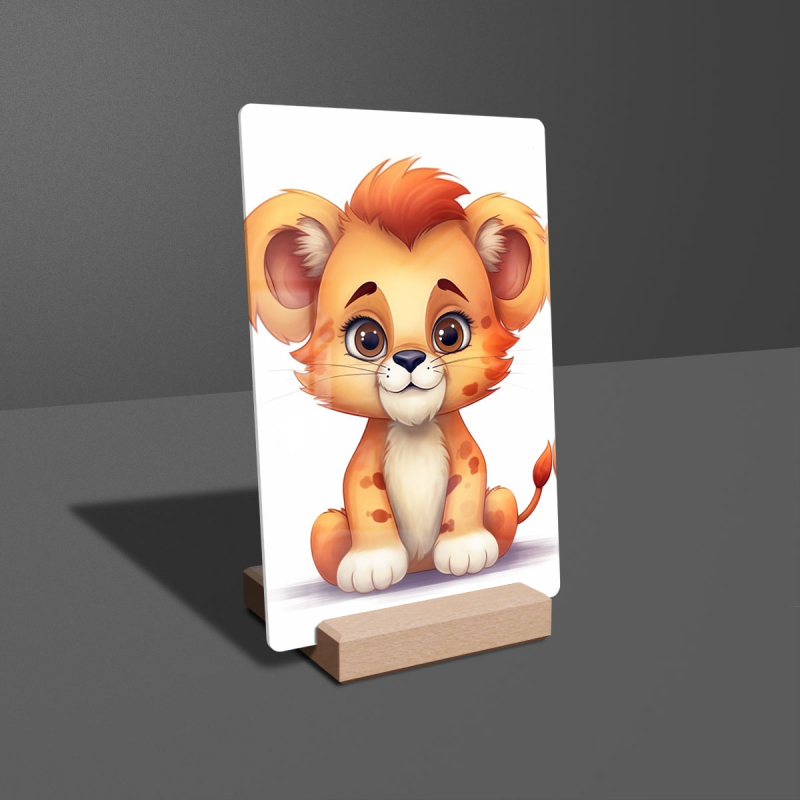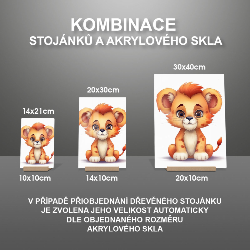 Na produktovém fotu vyobrazena nejoblíbenější varianta akrylového skla 14x21/21x14cm a dřevěný stojánek 10x10cm.