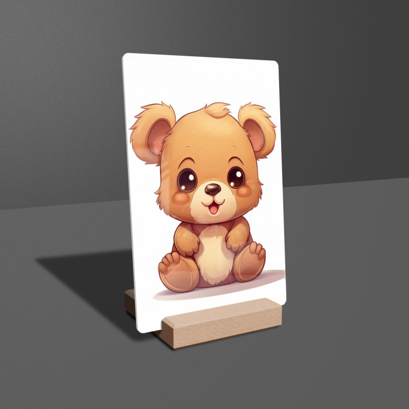 Na produktovém fotu vyobrazena nejoblíbenější varianta akrylového skla 14x21/21x14cm a dřevěný stojánek 10x10cm.