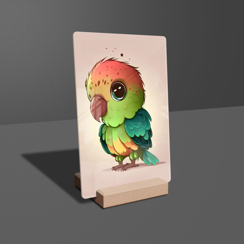 Na produktovém fotu vyobrazena nejoblíbenější varianta akrylového skla 14x21/21x14cm a dřevěný stojánek 10x10cm.