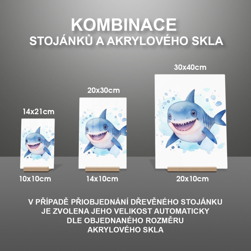 Na produktovém fotu vyobrazena nejoblíbenější varianta akrylového skla 14x21/21x14cm a dřevěný stojánek 10x10cm.