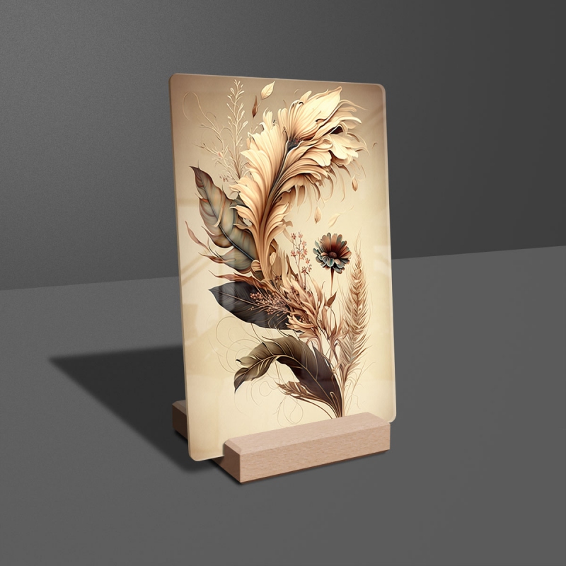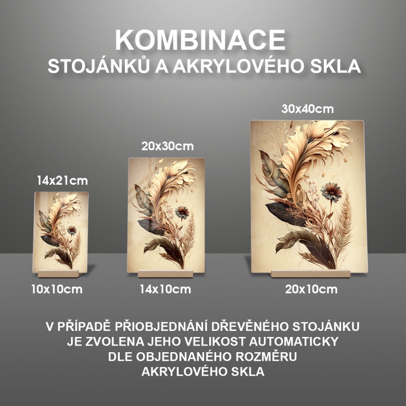 Na produktovém fotu vyobrazena nejoblíbenější varianta akrylového skla 14x21/21x14cm a dřevěný stojánek 10x10cm.