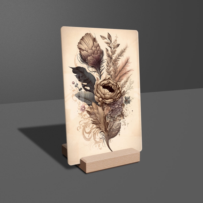 Na produktovém fotu vyobrazena nejoblíbenější varianta akrylového skla 14x21/21x14cm a dřevěný stojánek 10x10cm.