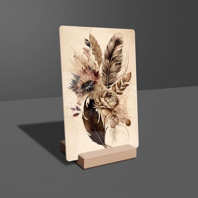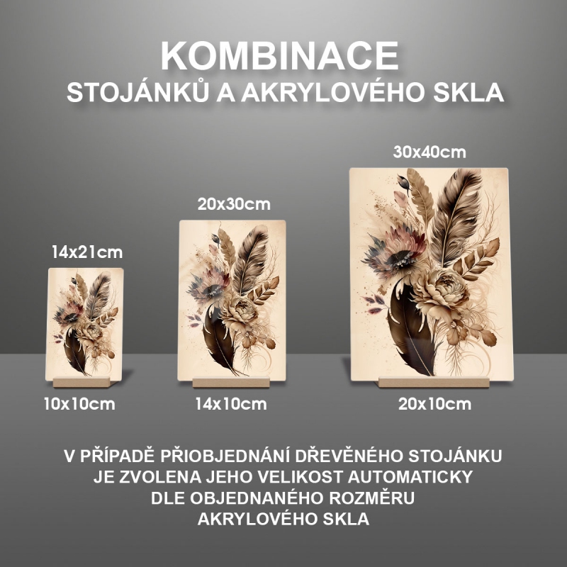 Na produktovém fotu vyobrazena nejoblíbenější varianta akrylového skla 14x21/21x14cm a dřevěný stojánek 10x10cm.