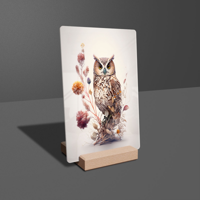 Na produktovém fotu vyobrazena nejoblíbenější varianta akrylového skla 14x21/21x14cm a dřevěný stojánek 10x10cm.