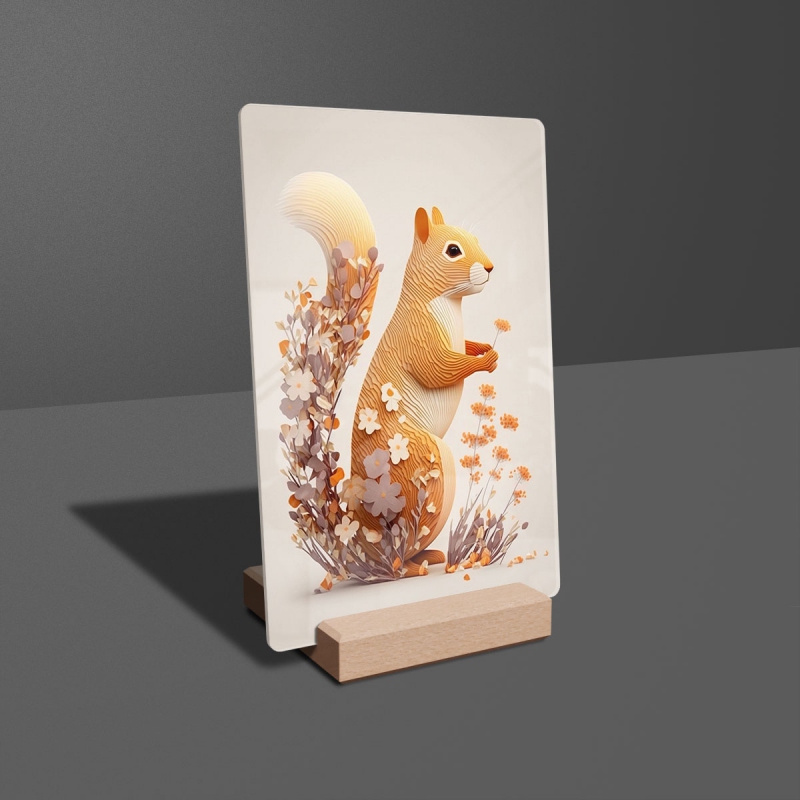 Na produktovém fotu vyobrazena nejoblíbenější varianta akrylového skla 14x21/21x14cm a dřevěný stojánek 10x10cm.