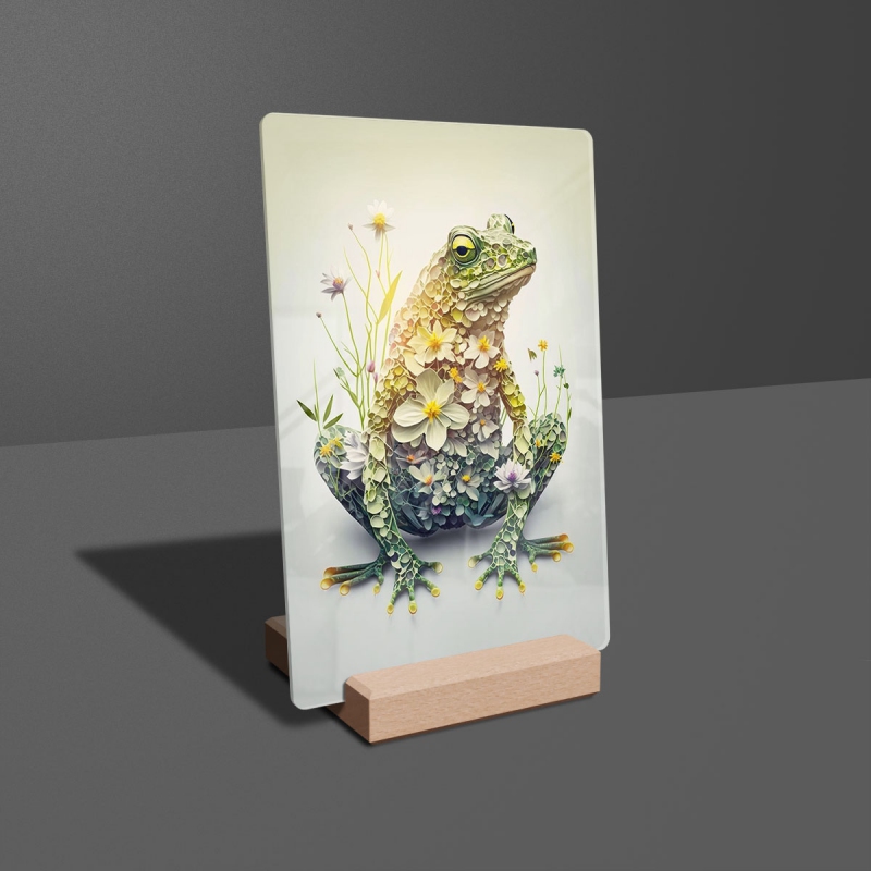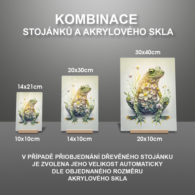 Na produktovém fotu vyobrazena nejoblíbenější varianta akrylového skla 14x21/21x14cm a dřevěný stojánek 10x10cm.