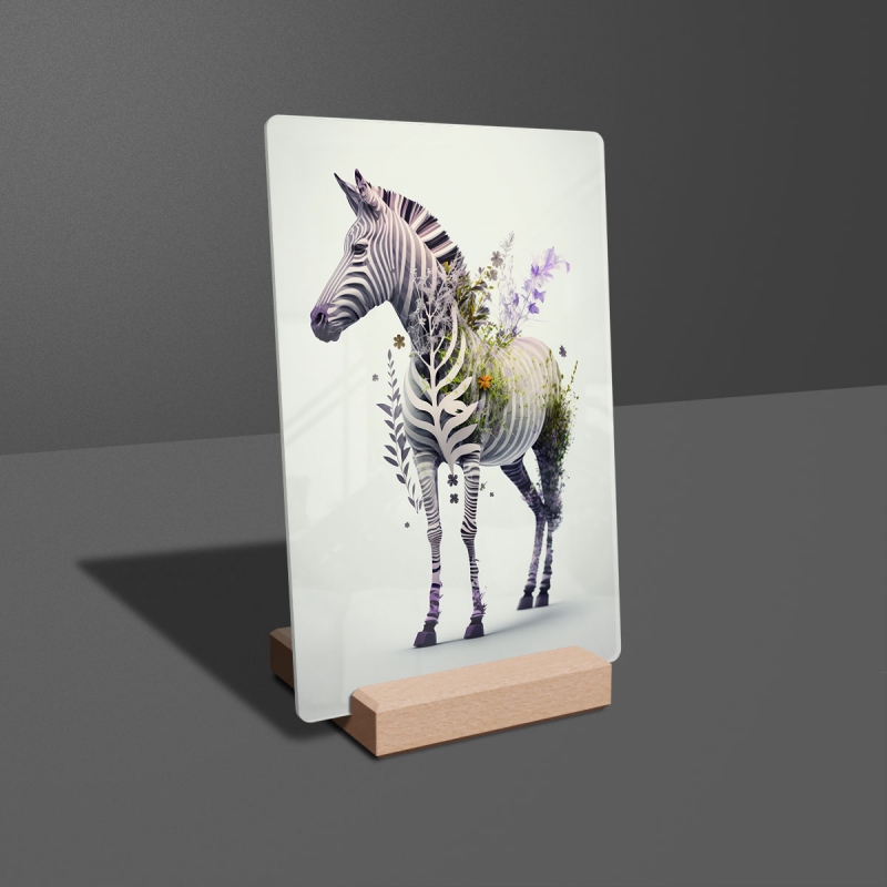 Na produktovém fotu vyobrazena nejoblíbenější varianta akrylového skla 14x21/21x14cm a dřevěný stojánek 10x10cm.