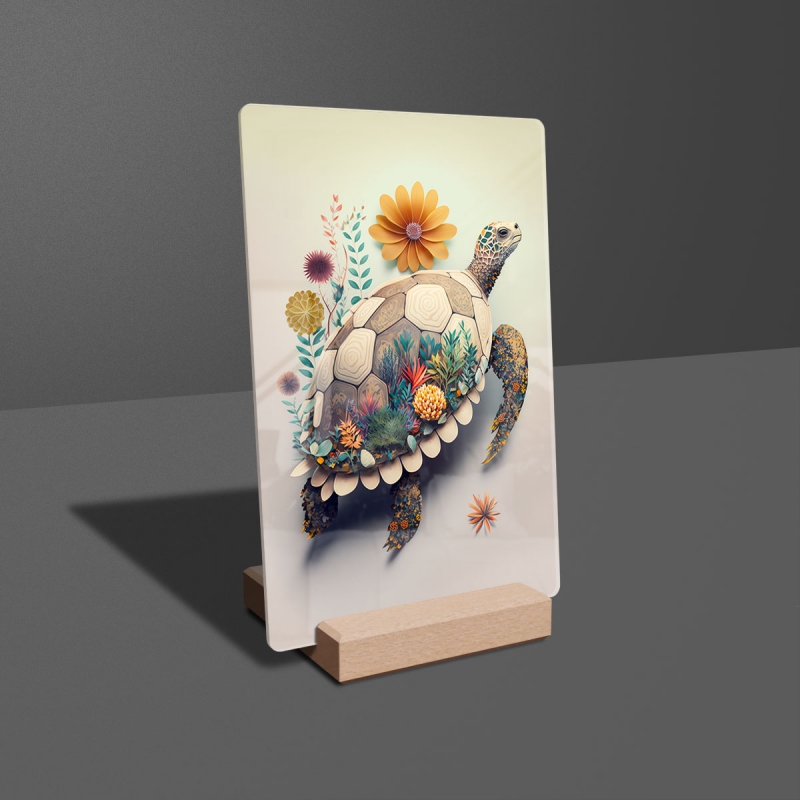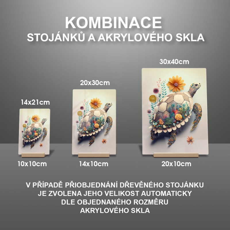 Na produktovém fotu vyobrazena nejoblíbenější varianta akrylového skla 14x21/21x14cm a dřevěný stojánek 10x10cm.