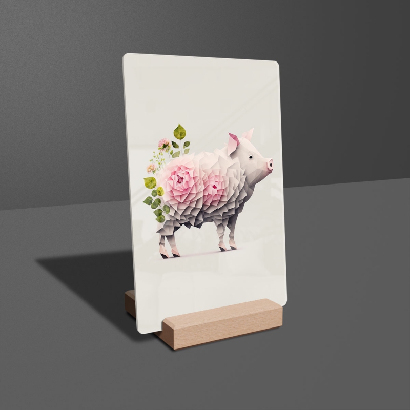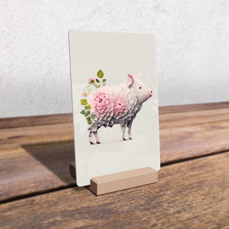 Na produktovém fotu vyobrazena nejoblíbenější varianta akrylového skla 14x21/21x14cm a dřevěný stojánek 10x10cm.