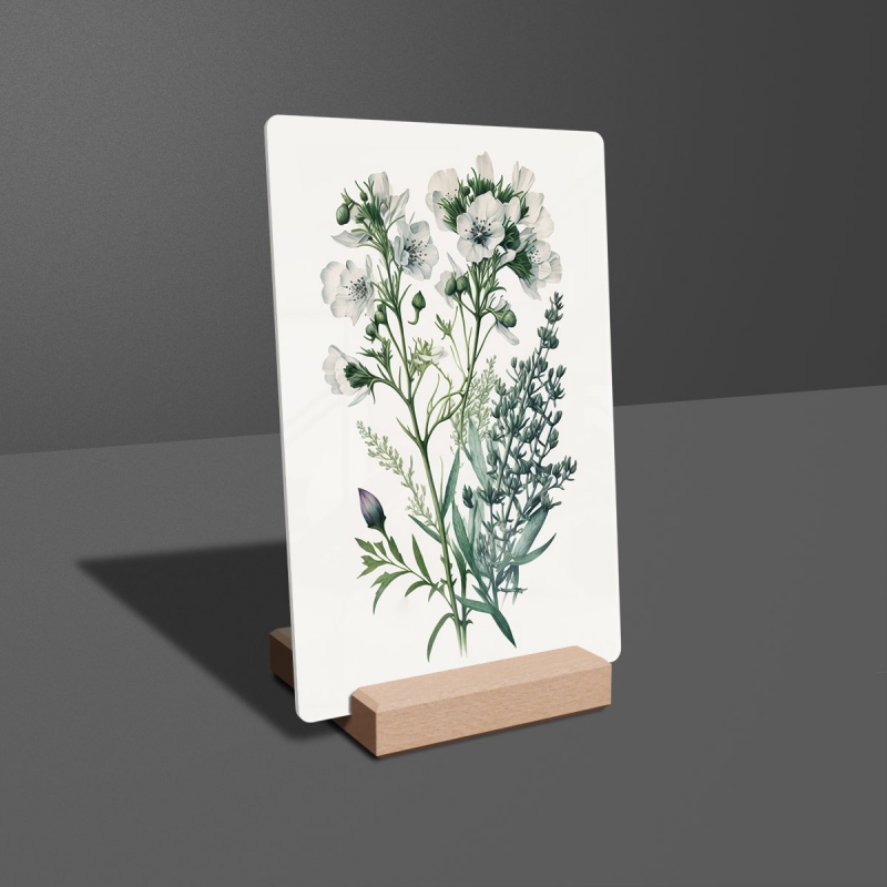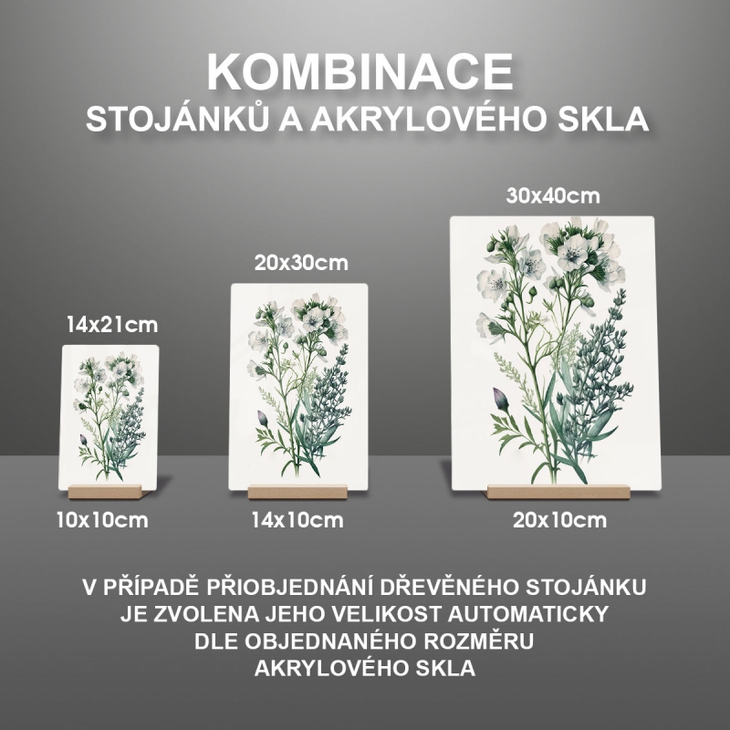 Na produktovém fotu vyobrazena nejoblíbenější varianta akrylového skla 14x21/21x14cm a dřevěný stojánek 10x10cm.