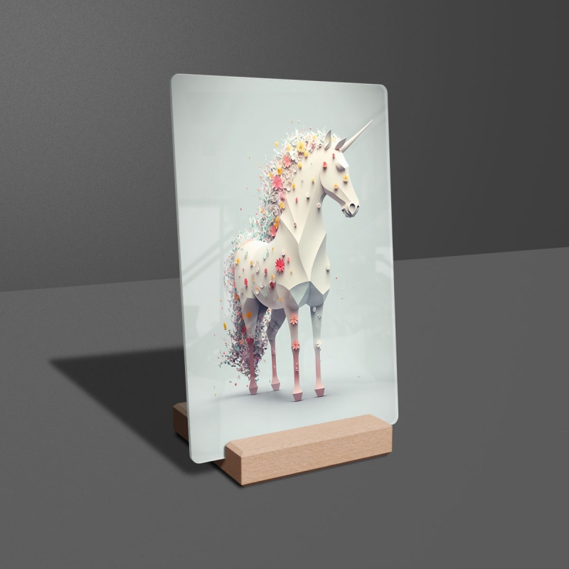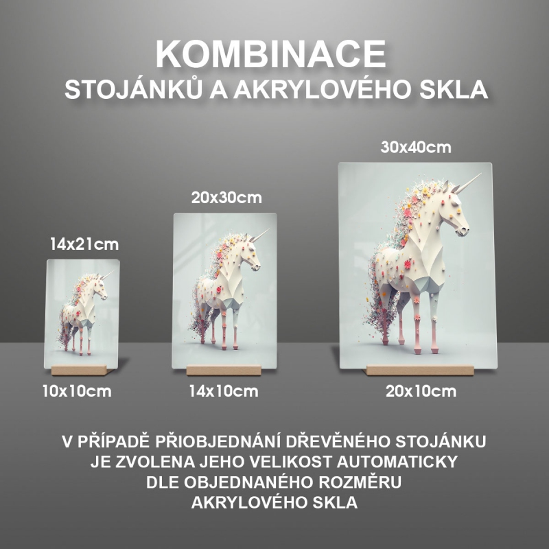 Na produktovém fotu vyobrazena nejoblíbenější varianta akrylového skla 14x21/21x14cm a dřevěný stojánek 10x10cm.
