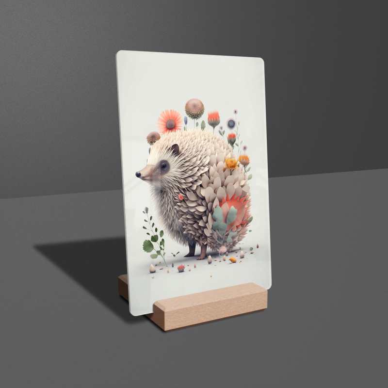 Na produktovém fotu vyobrazena nejoblíbenější varianta akrylového skla 14x21/21x14cm a dřevěný stojánek 10x10cm.