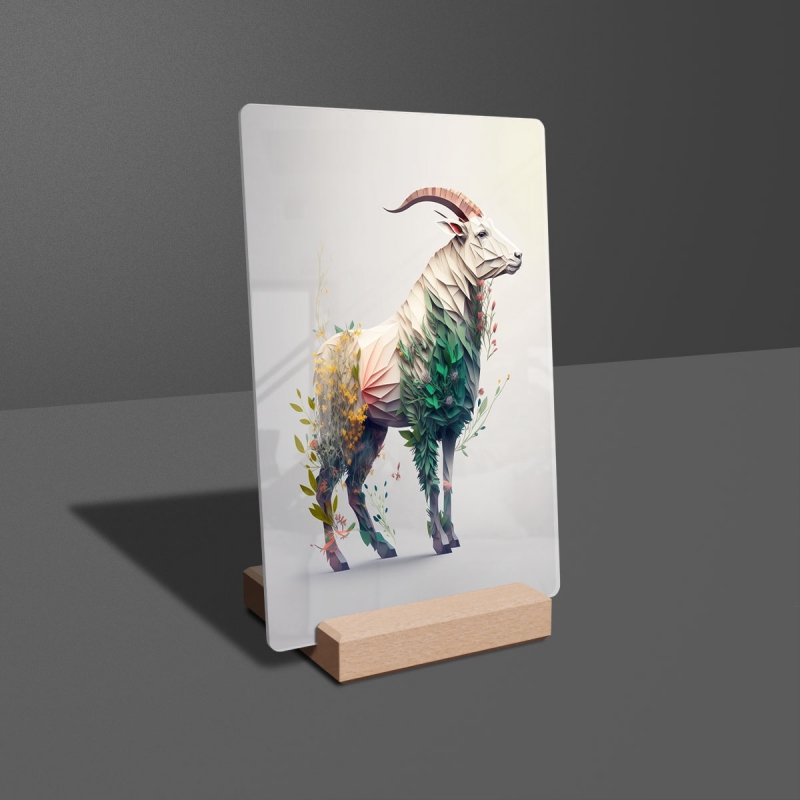 Na produktovém fotu vyobrazena nejoblíbenější varianta akrylového skla 14x21/21x14cm a dřevěný stojánek 10x10cm.