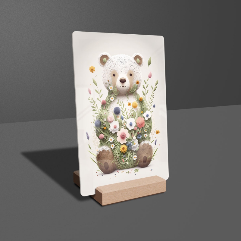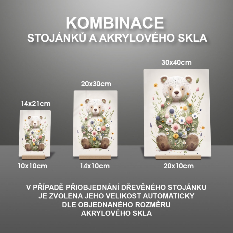 Na produktovém fotu vyobrazena nejoblíbenější varianta akrylového skla 14x21/21x14cm a dřevěný stojánek 10x10cm.