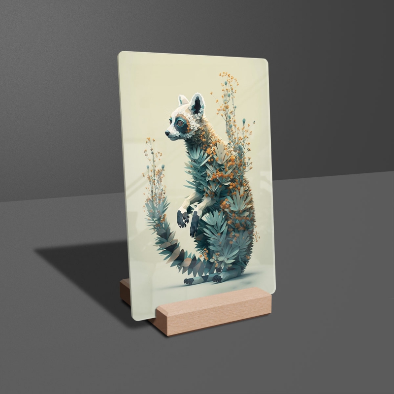 Na produktovém fotu vyobrazena nejoblíbenější varianta akrylového skla 14x21/21x14cm a dřevěný stojánek 10x10cm.