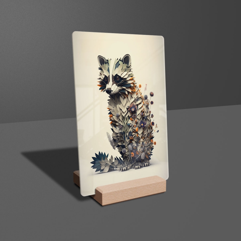 Na produktovém fotu vyobrazena nejoblíbenější varianta akrylového skla 14x21/21x14cm a dřevěný stojánek 10x10cm.