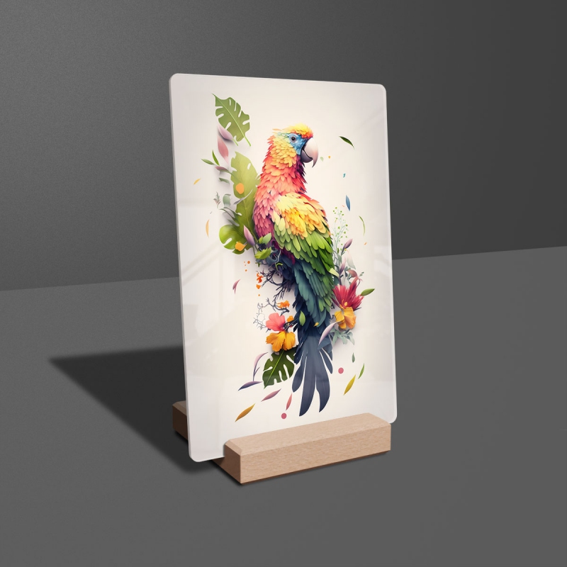 Na produktovém fotu vyobrazena nejoblíbenější varianta akrylového skla 14x21/21x14cm a dřevěný stojánek 10x10cm.