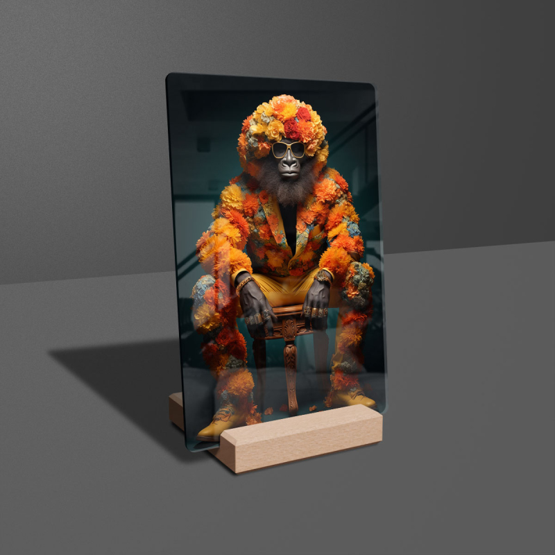 Na produktovém fotu vyobrazena nejoblíbenější varianta akrylového skla 14x21/21x14cm a dřevěný stojánek 10x10cm.