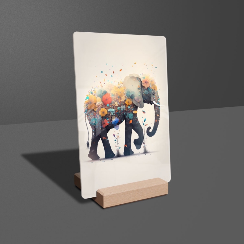 Na produktovém fotu vyobrazena nejoblíbenější varianta akrylového skla 14x21/21x14cm a dřevěný stojánek 10x10cm.
