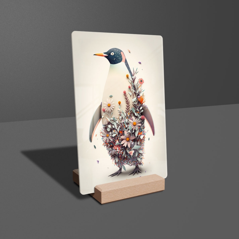 Na produktovém fotu vyobrazena nejoblíbenější varianta akrylového skla 14x21/21x14cm a dřevěný stojánek 10x10cm.