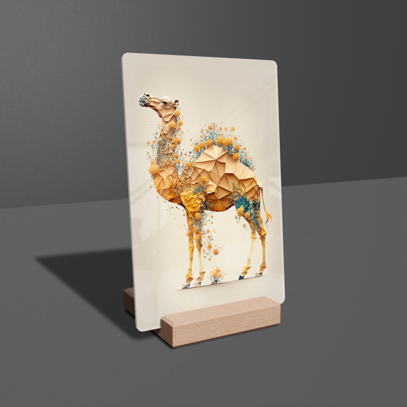 Na produktovém fotu vyobrazena nejoblíbenější varianta akrylového skla 14x21/21x14cm a dřevěný stojánek 10x10cm.