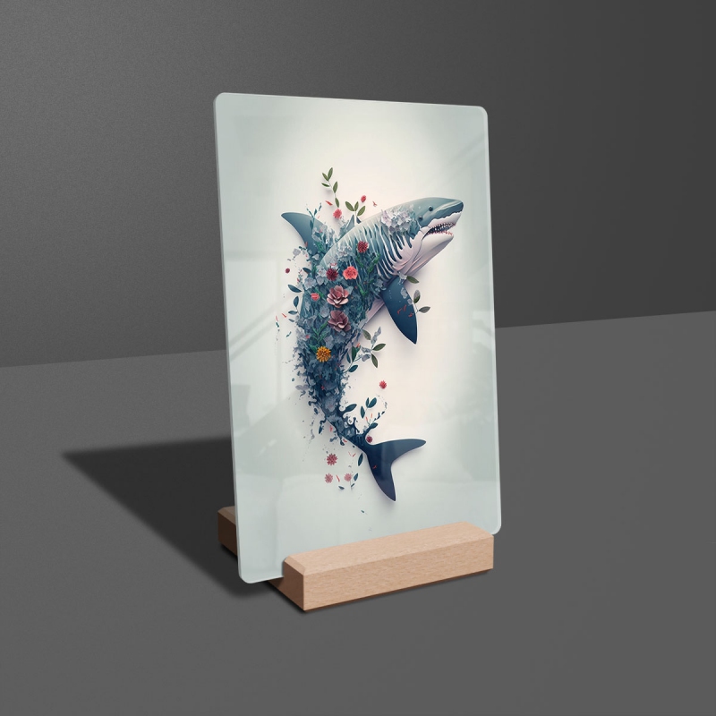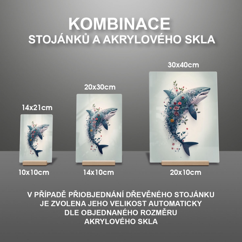 Na produktovém fotu vyobrazena nejoblíbenější varianta akrylového skla 14x21/21x14cm a dřevěný stojánek 10x10cm.
