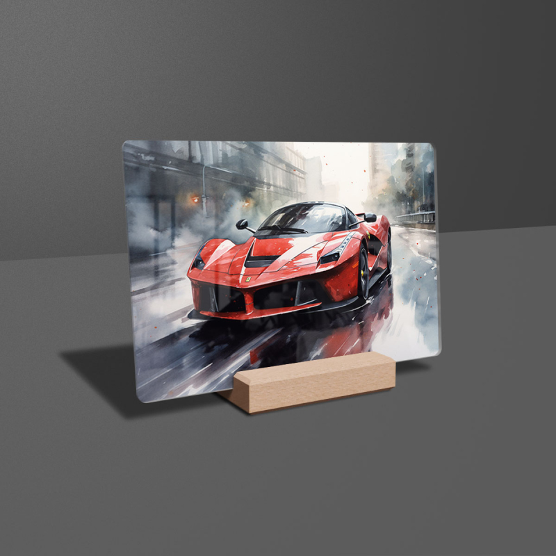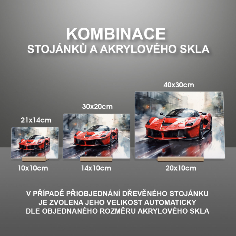Na produktovém fotu vyobrazena nejoblíbenější varianta akrylového skla 14x21/21x14cm a dřevěný stojánek 10x10cm.