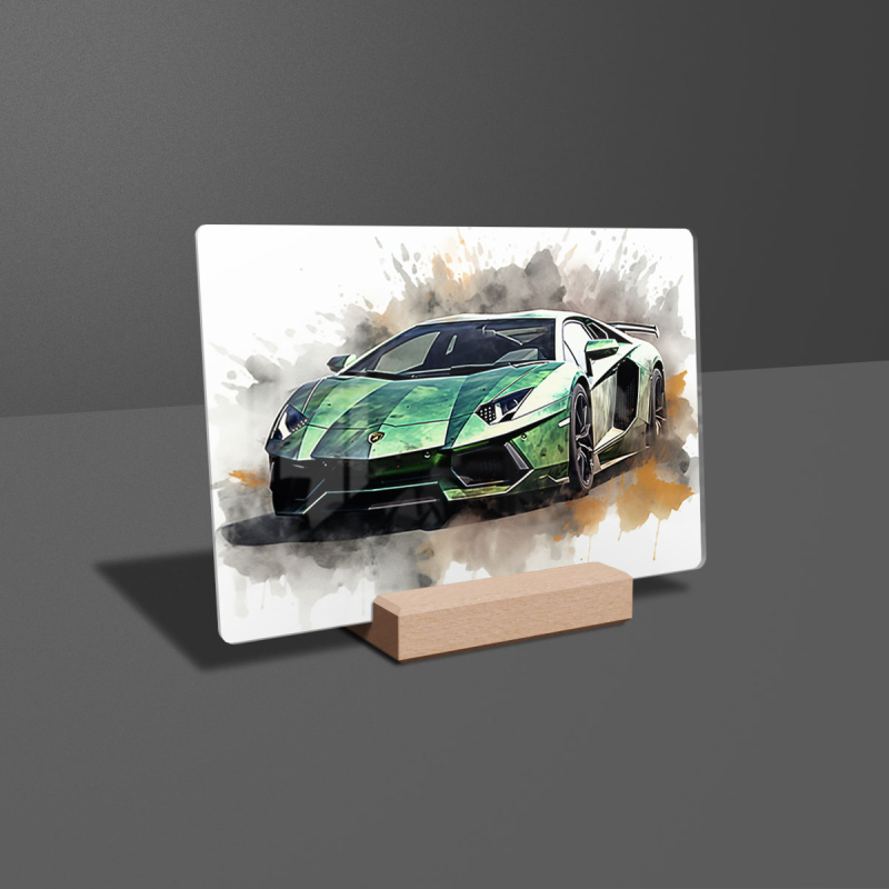 Na produktovém fotu vyobrazena nejoblíbenější varianta akrylového skla 14x21/21x14cm a dřevěný stojánek 10x10cm.
