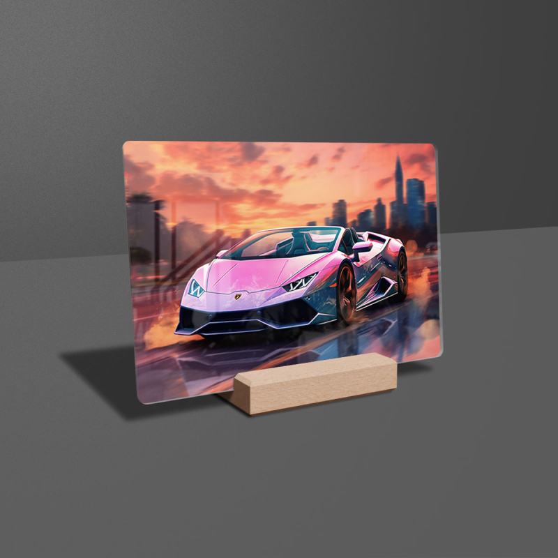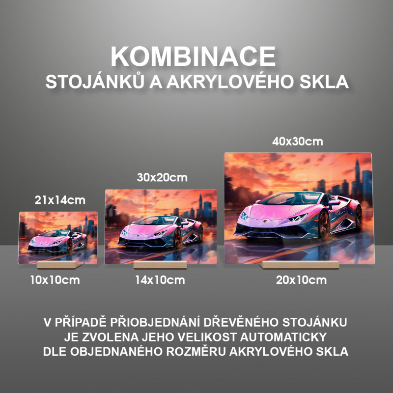 Na produktovém fotu vyobrazena nejoblíbenější varianta akrylového skla 14x21/21x14cm a dřevěný stojánek 10x10cm.