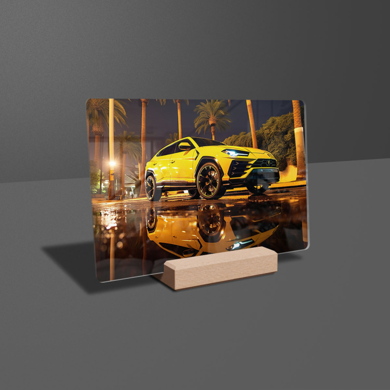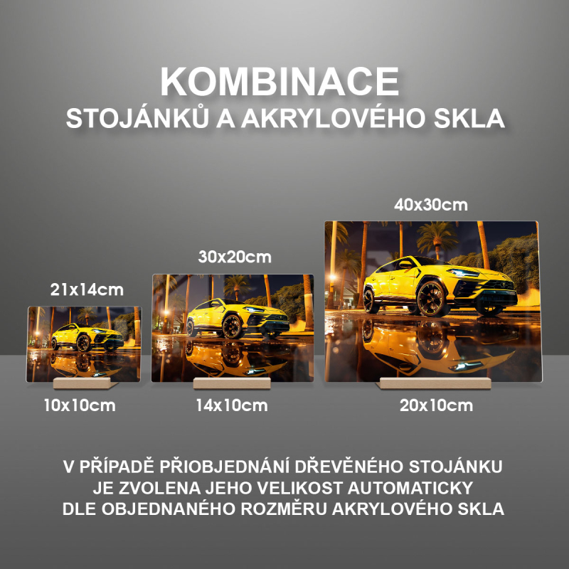 Na produktovém fotu vyobrazena nejoblíbenější varianta akrylového skla 14x21/21x14cm a dřevěný stojánek 10x10cm.
