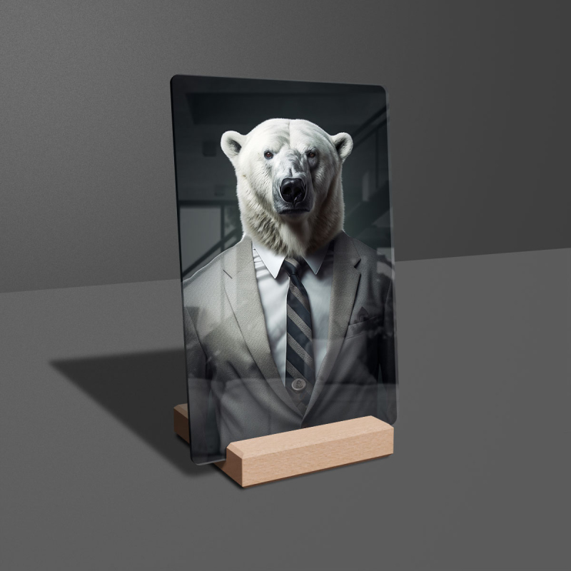 Na produktovém fotu vyobrazena nejoblíbenější varianta akrylového skla 14x21/21x14cm a dřevěný stojánek 10x10cm.