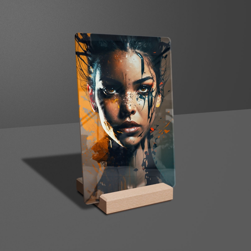 Na produktovém fotu vyobrazena nejoblíbenější varianta akrylového skla 14x21/21x14cm a dřevěný stojánek 10x10cm.