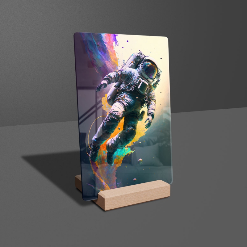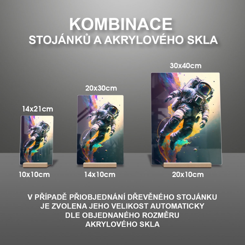 Na produktovém fotu vyobrazena nejoblíbenější varianta akrylového skla 14x21/21x14cm a dřevěný stojánek 10x10cm.