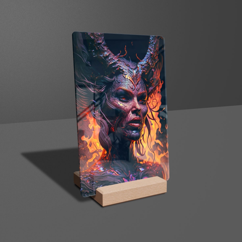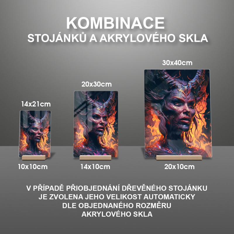 Na produktovém fotu vyobrazena nejoblíbenější varianta akrylového skla 14x21/21x14cm a dřevěný stojánek 10x10cm.