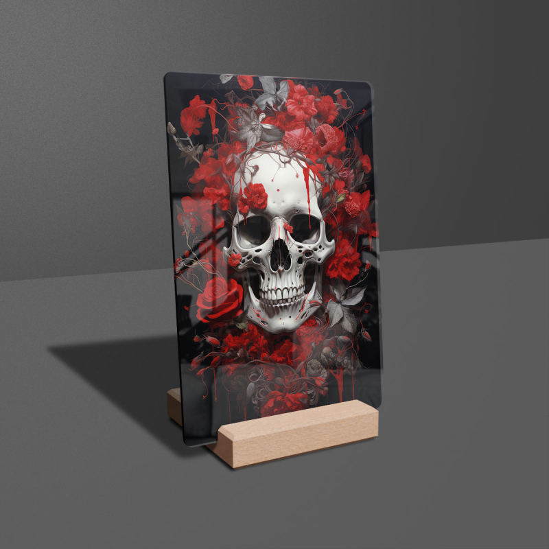 Na produktovém fotu vyobrazena nejoblíbenější varianta akrylového skla 14x21/21x14cm a dřevěný stojánek 10x10cm.