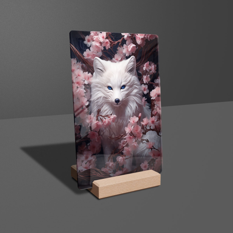 Na produktovém fotu vyobrazena nejoblíbenější varianta akrylového skla 14x21/21x14cm a dřevěný stojánek 10x10cm.