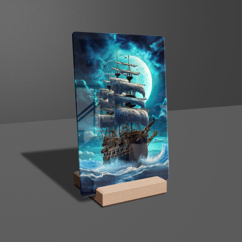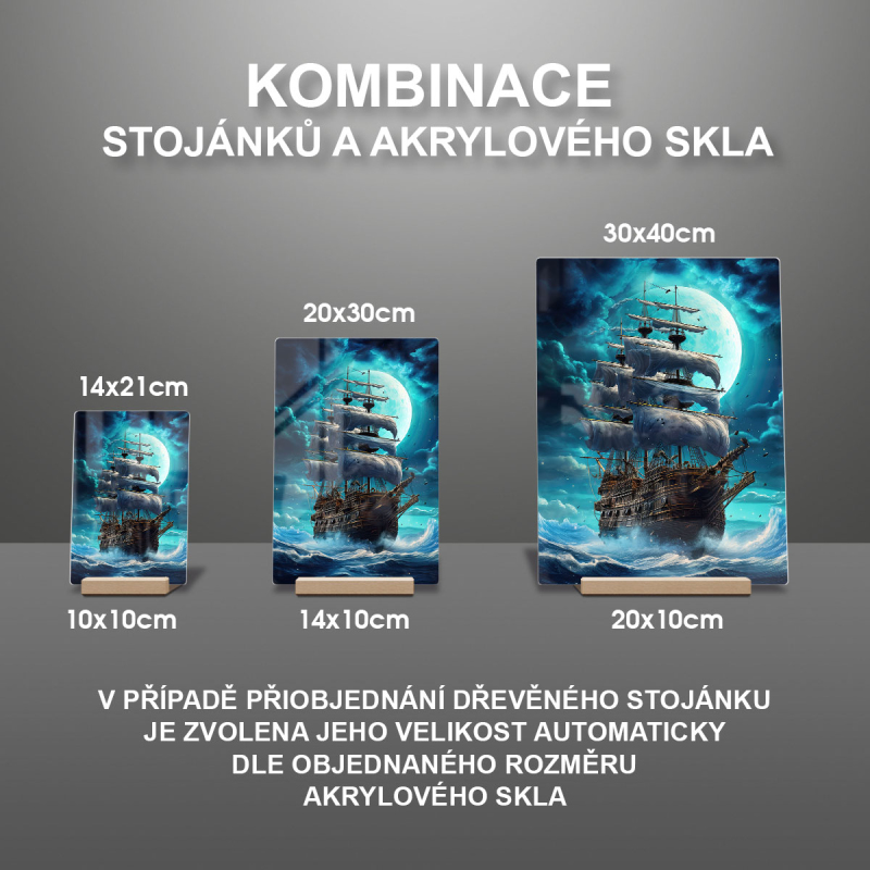 Na produktovém fotu vyobrazena nejoblíbenější varianta akrylového skla 14x21/21x14cm a dřevěný stojánek 10x10cm.