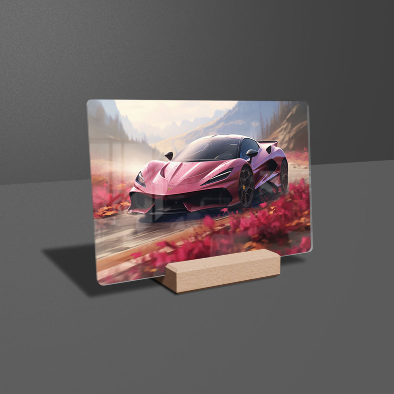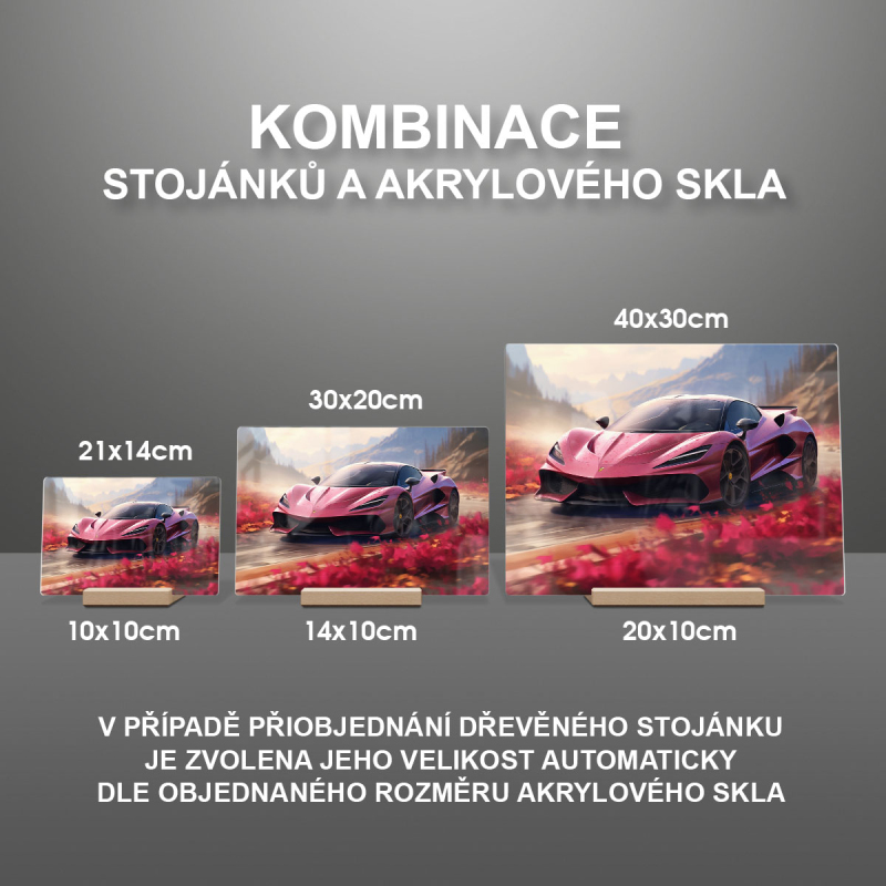Na produktovém fotu vyobrazena nejoblíbenější varianta akrylového skla 14x21/21x14cm a dřevěný stojánek 10x10cm.