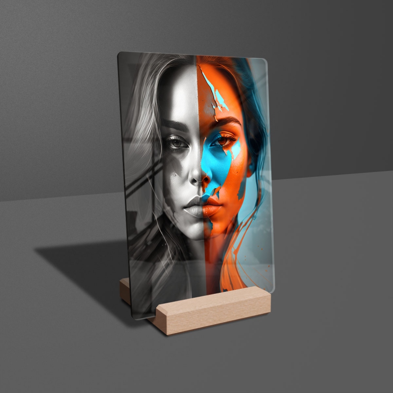 Na produktovém fotu vyobrazena nejoblíbenější varianta akrylového skla 14x21/21x14cm a dřevěný stojánek 10x10cm.
