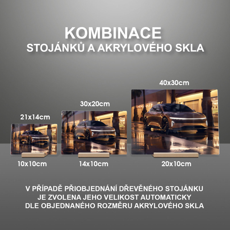 Na produktovém fotu vyobrazena nejoblíbenější varianta akrylového skla 14x21/21x14cm a dřevěný stojánek 10x10cm.