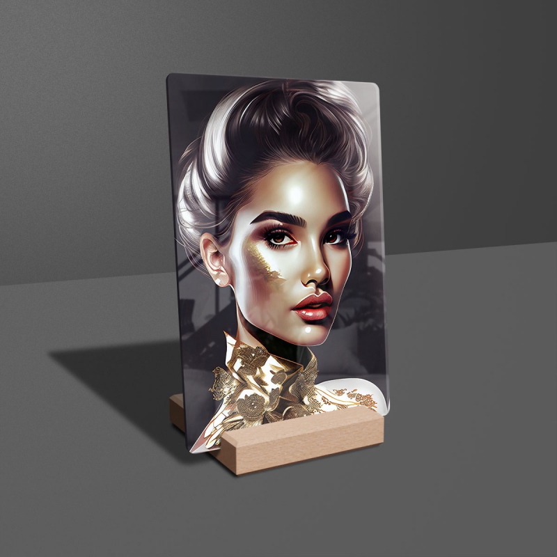 Na produktovém fotu vyobrazena nejoblíbenější varianta akrylového skla 14x21/21x14cm a dřevěný stojánek 10x10cm.