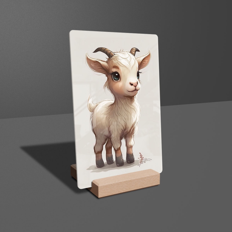 Na produktovém fotu vyobrazena nejoblíbenější varianta akrylového skla 14x21/21x14cm a dřevěný stojánek 10x10cm.