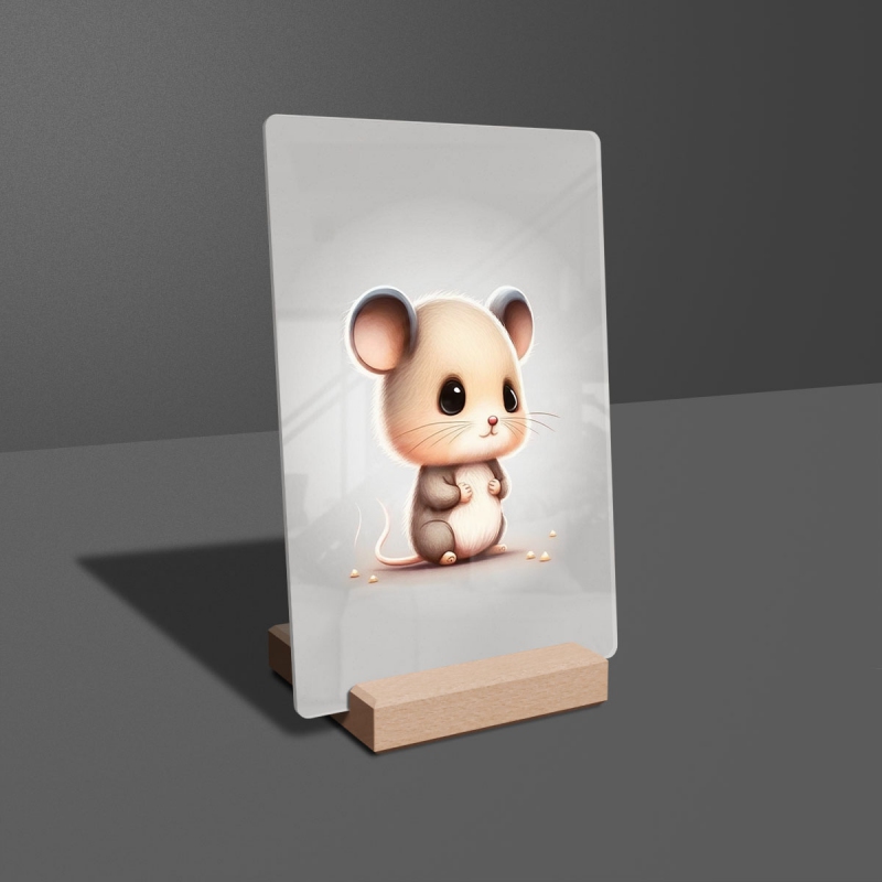Na produktovém fotu vyobrazena nejoblíbenější varianta akrylového skla 14x21/21x14cm a dřevěný stojánek 10x10cm.