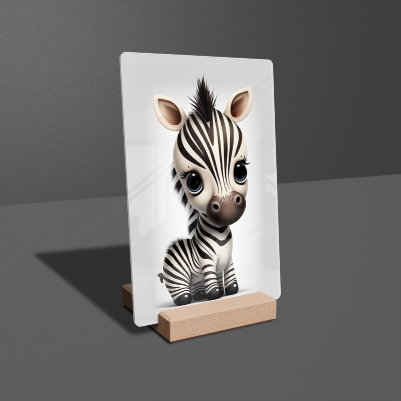 Na produktovém fotu vyobrazena nejoblíbenější varianta akrylového skla 14x21/21x14cm a dřevěný stojánek 10x10cm.