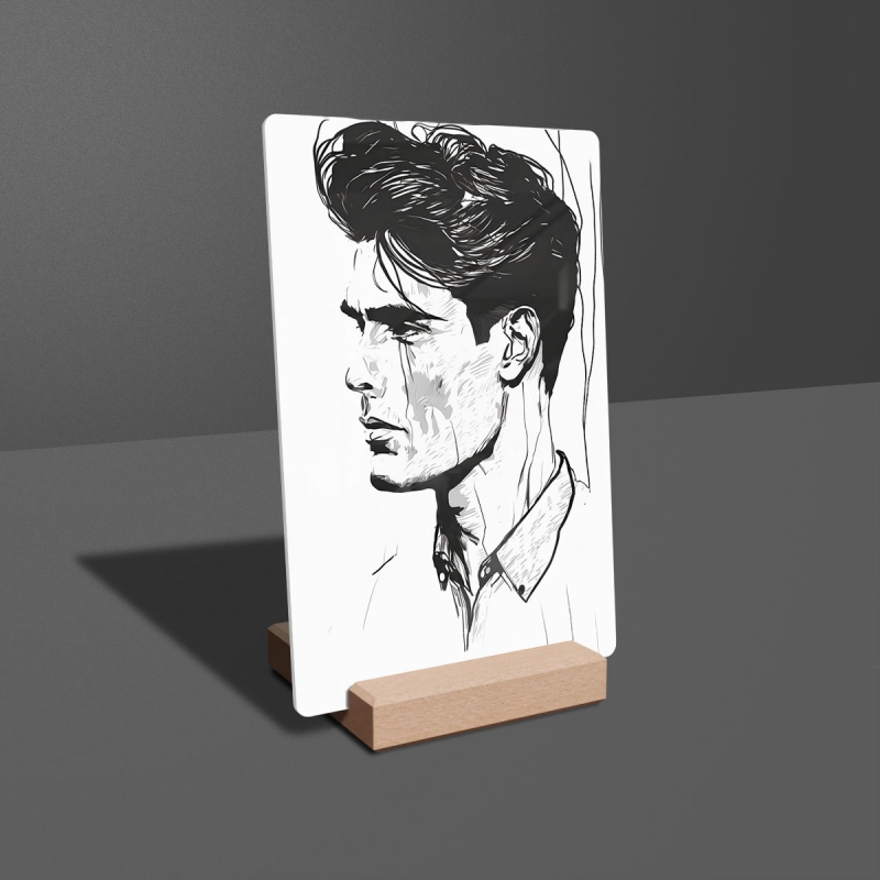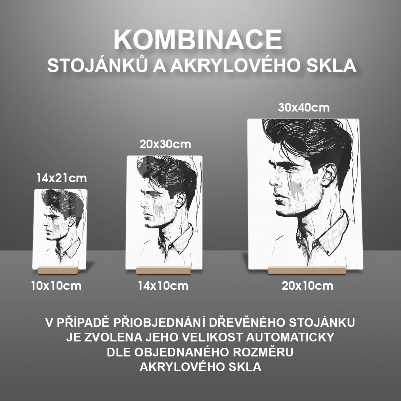 Na produktovém fotu vyobrazena nejoblíbenější varianta akrylového skla 14x21/21x14cm a dřevěný stojánek 10x10cm.