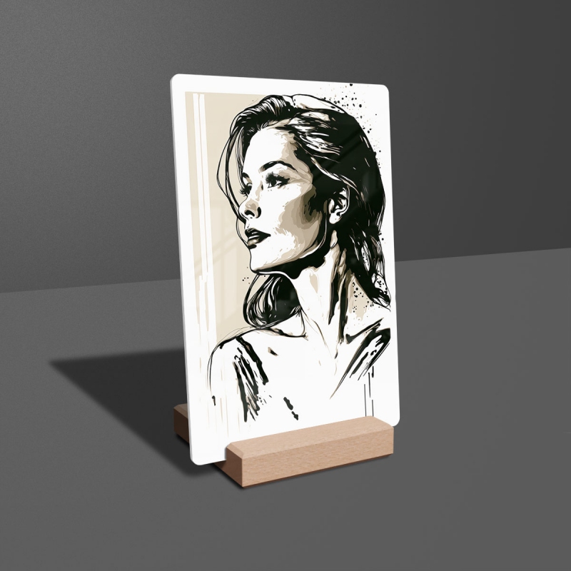 Na produktovém fotu vyobrazena nejoblíbenější varianta akrylového skla 14x21/21x14cm a dřevěný stojánek 10x10cm.