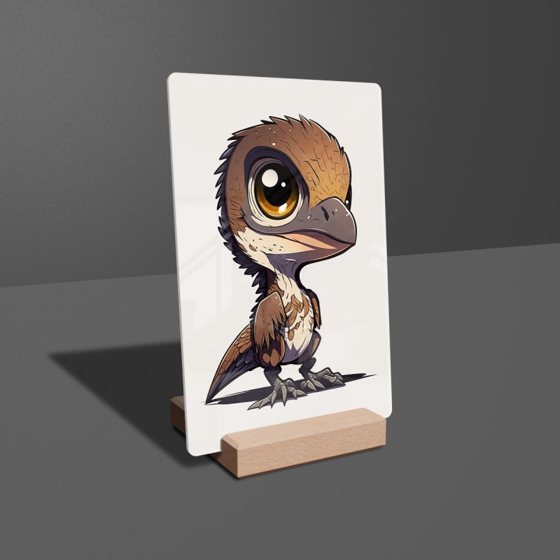 Na produktovém fotu vyobrazena nejoblíbenější varianta akrylového skla 14x21/21x14cm a dřevěný stojánek 10x10cm.