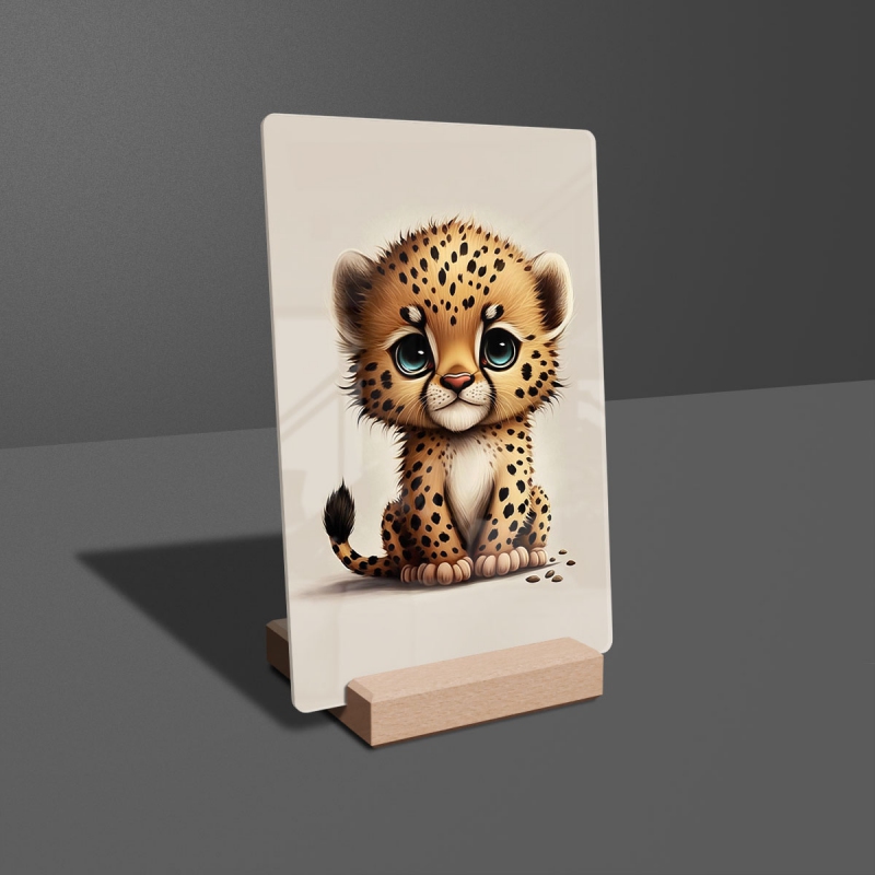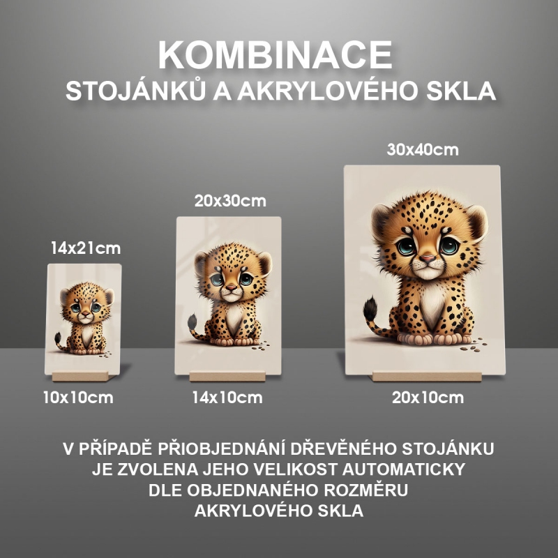 Na produktovém fotu vyobrazena nejoblíbenější varianta akrylového skla 14x21/21x14cm a dřevěný stojánek 10x10cm.