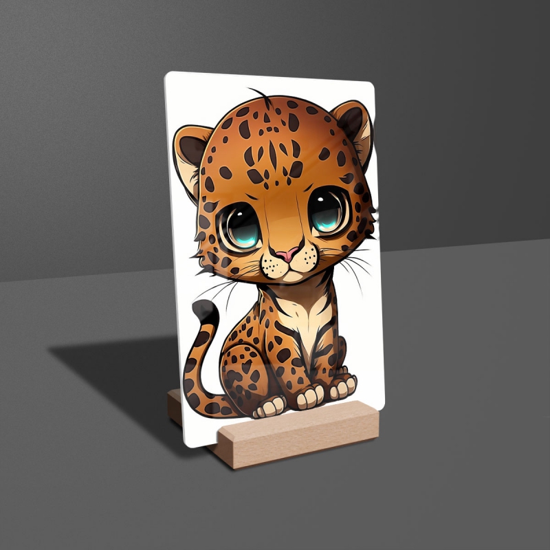 Na produktovém fotu vyobrazena nejoblíbenější varianta akrylového skla 14x21/21x14cm a dřevěný stojánek 10x10cm.