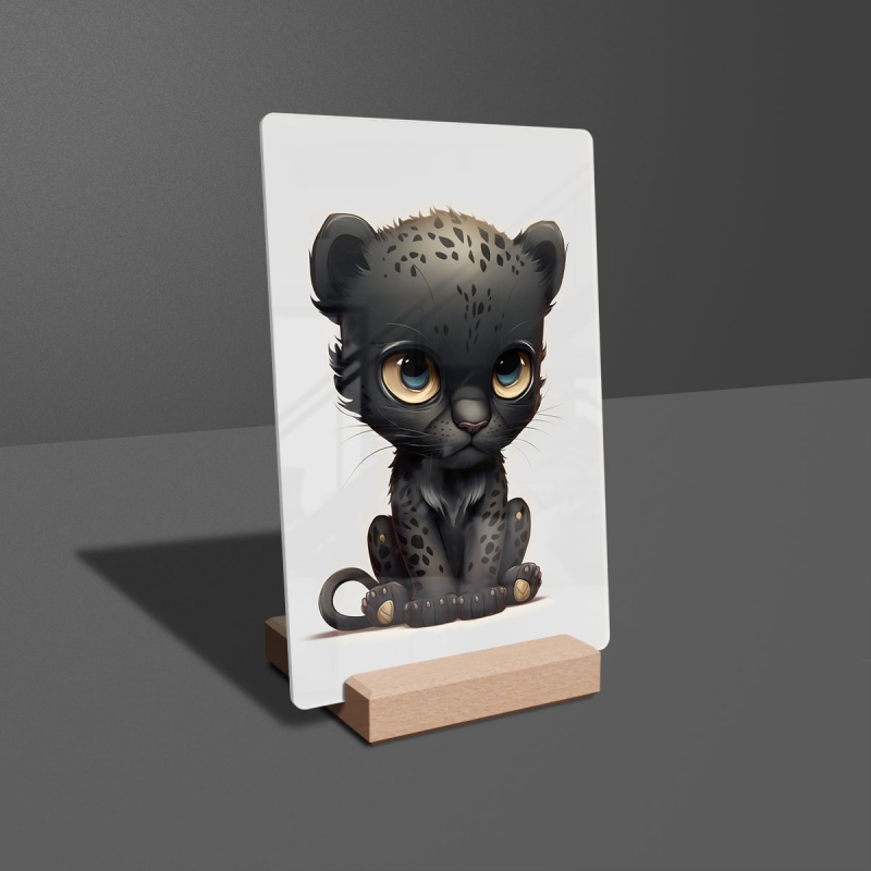 Na produktovém fotu vyobrazena nejoblíbenější varianta akrylového skla 14x21/21x14cm a dřevěný stojánek 10x10cm.